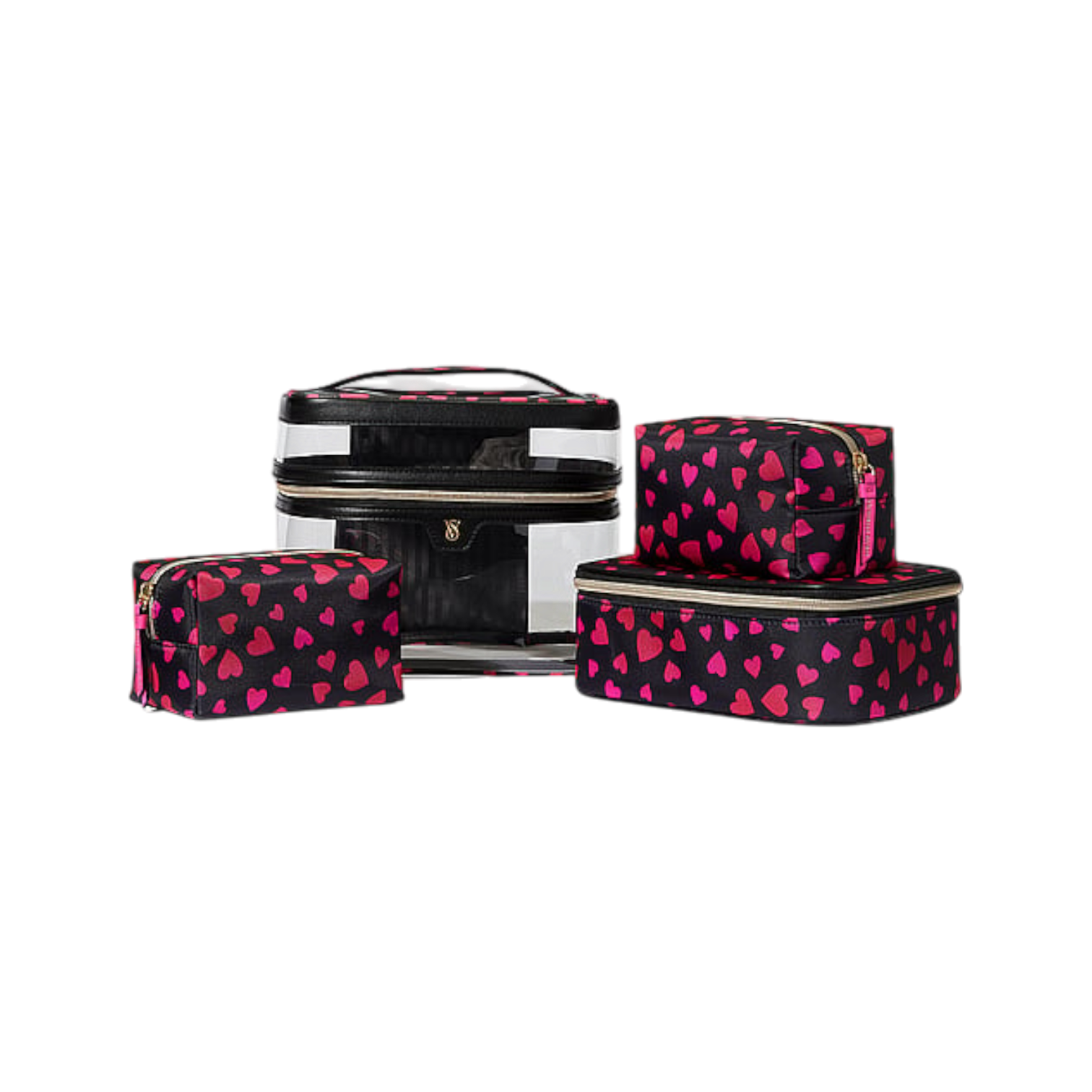 Ceļojumu kosmētikas somiņu komplekts ar sirsniņu rakstu, kas palīdz ērti sakārtot visu nepieciešamo ilgākam izbraucienam. Caurspīdīgā ārējā soma ļauj ātri pārskatīt saturu, bet iekšējie maciņi un apakšējā daļa nodrošina vēl ērtāku kārtību kosmētikai, otām un kopšanas produktiem.