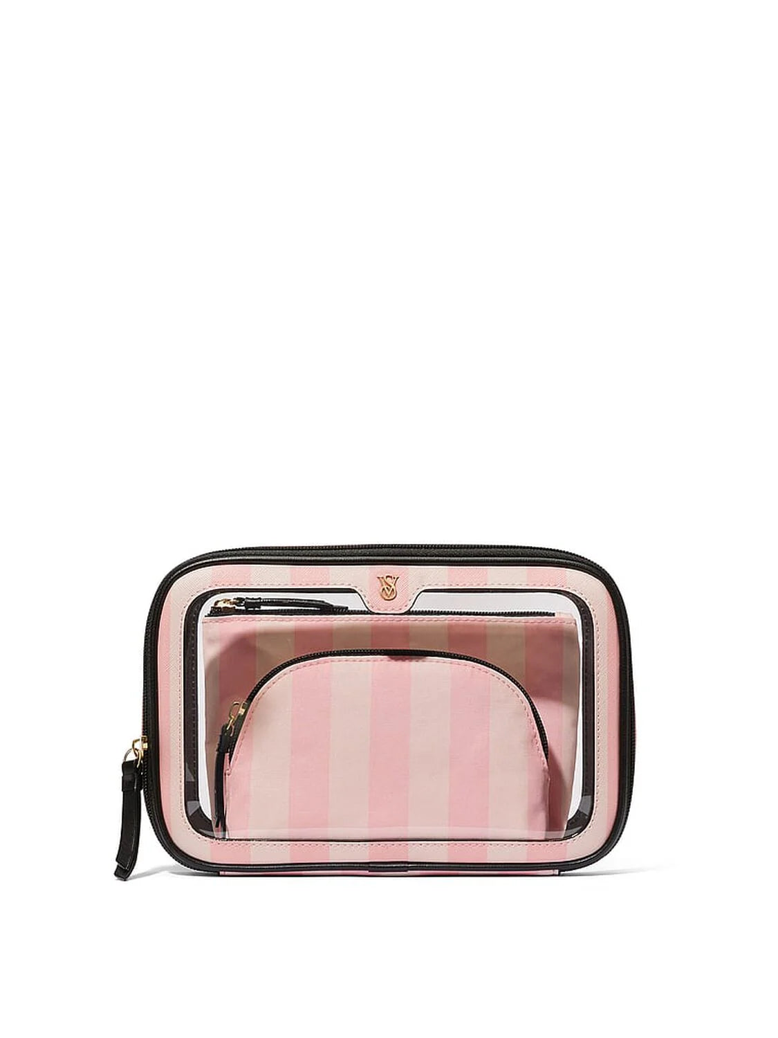 Klasisks Victoria’s Secret kosmētikas maciņu komplekts ar rozā svītrām, kas palīdz ērti sakārtot visu nepieciešamo gan ikdienā, gan ceļojumos. Caurspīdīgais ārējais maciņš ļauj ātri atrast vajadzīgo, bet 2 iekšējie maciņi ir ideāli kosmētikai, otu komplektam un sīkumiem.