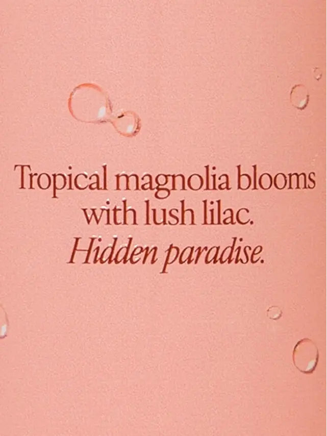 Parfimēts ķermeņa sprejs 250ml. Sulīgs, tropiski ziedošs un atsvaidzinoši augļains aromāts, kur eksotiska magnolija saplūst ar maigi saldo meloni un gaisīgu ceriņu pieskārienu, radot vieglu, vasarīgu noskaņu un “hidden paradise” sajūtu visas dienas garumā!