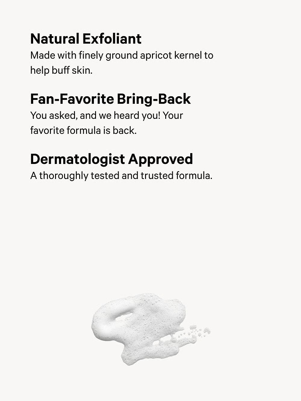 Sastāvs (INCI): Water (Aqua, Eau), Cocamidopropyl Betaine, Glycerin, Sodium Hydroxypropyl Starch Phosphate, Sodium Lauroyl Glycinate, Isopropyl Myristate, Sodium Lauroyl Isethionate, Palmitic Acid, Cocos Nucifera (Coconut) Oil, Fragrance (Parfum), Lauric Acid, Prunus Armeniaca (Apricot) Seed Powder, Phenoxyethanol, Hydroxyacetophenone, Stearic Acid, Pyrus Malus (Apple) Fruit Extract, Propylene Glycol, Malic Acid, Guar Hydroxypropyltrimonium Chloride, Citric Acid, Glycolic Acid, Lactic Acid, Tetrasodium Glutamate Diacetate, Leuconostoc/Radish Root Ferment Filtrate, Hexamethylindanopyran, Tetramethyl acetyloctahydronaphthalenes, Hexyl Cinnamal, Linalool, Benzyl Salicylate, Limonene, Linalyl acetate, Hydroxycitronellal