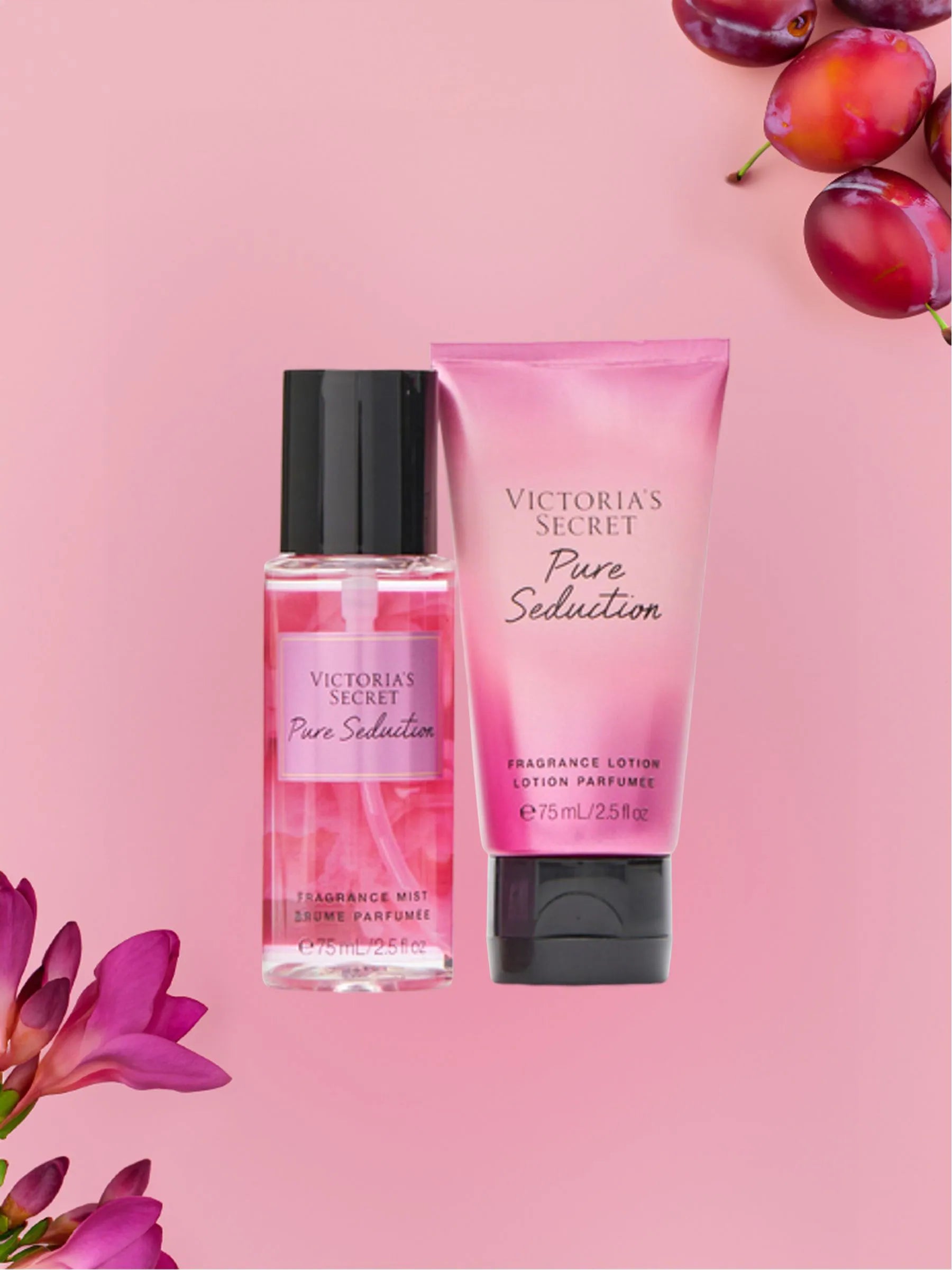 Dāvanu komplekts (Gift Set). Victoria’s Secret Pure Seduction ir koķets un sievišķīgs mini komplekts, kas apvieno aromātu un ādas kopšanu vienā skaistā duetā. Komplektā ir ķermeņa sprejs un ķermeņa losjons, kas kopā rada koptu, saldeni augļainu noskaņu – sulīga plūme un maigi ziedainā frēzija padara šo aromātu īpaši vilinošu un viegli atpazīstamu.