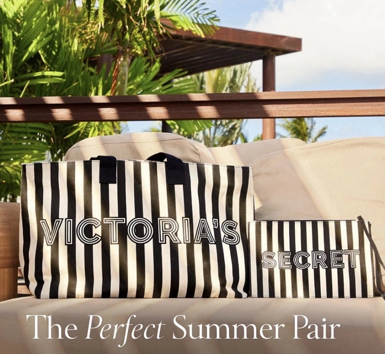Svītraina Victoria’s Secret tote soma ar pieskaņotu rokas maciņu - stilīgs un praktisks komplekts ikdienai, darbam vai izbraucieniem. Ietilpīga, ērta un viegli kombinējama, lai viss svarīgais vienmēr būtu līdzi.