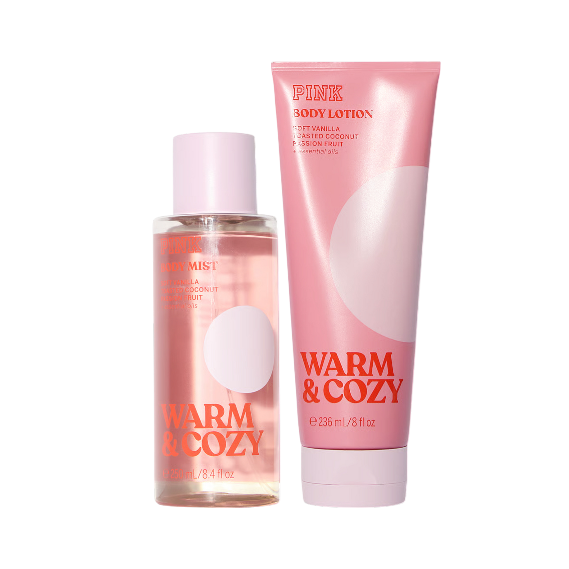 Komplekts ar parfimētu ķermeņa spreju 250 ml un losjonu 236 ml no Victoria’s Secret PINK kolekcijas, ar ēteriskajām eļļām. Mājīgs, silts un neatvairāmi komfortabls aromāts – maiga vaniļa saplūst ar grauzdēta kokosrieksta siltumu un sulīgas pasifloras dzīvīgumu. Komplektā aromāts atklājas pilnīgāk: sprejs sniedz vieglu svaigumu, bet losjons – krēmīgu dziļumu, komfortu un noturību.