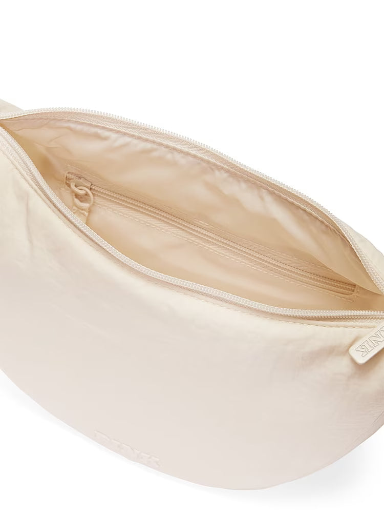 Balta pusmēness formas plecu soma no PINK kolekcijas, kas izskatās tīri, eleganti un viegli pieskaņojama jebkuram tēlam. Ērta ikdienai, kompakta, bet pietiekami ietilpīga, lai viss svarīgais būtu vienmēr līdzi.